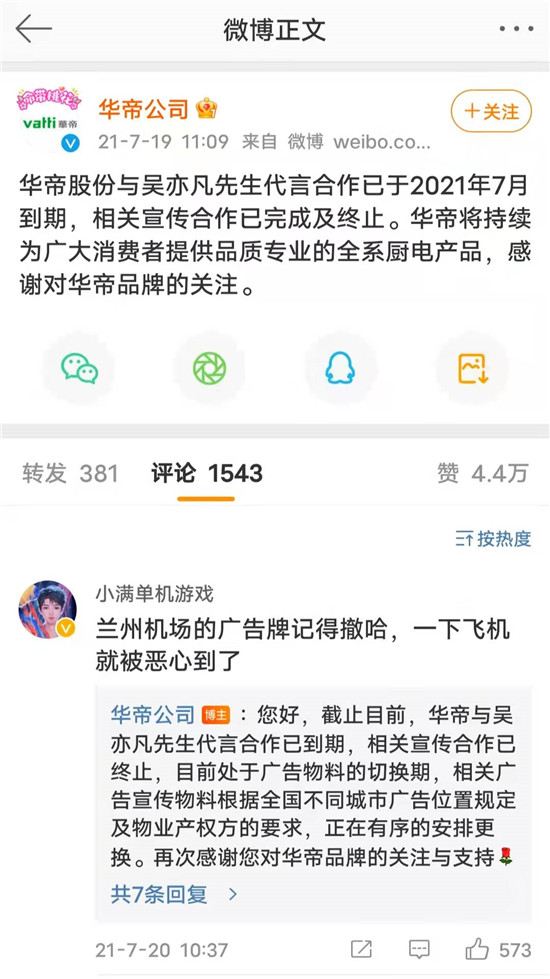 其中最著名的當屬華帝和吳亦凡的代言約,在劣跡藝人吳亦凡的違法事跡被揭露的第一時間,華帝發微博宣布合約已經到期,并在微博評論區回復網友:“相關廣告宣傳物料根據全國不用城市廣告位置規定及物業產權方的要求,正在有序安排更換。”輿情處理及時,回復有理有據且態度較好,得到了網友們的好評。