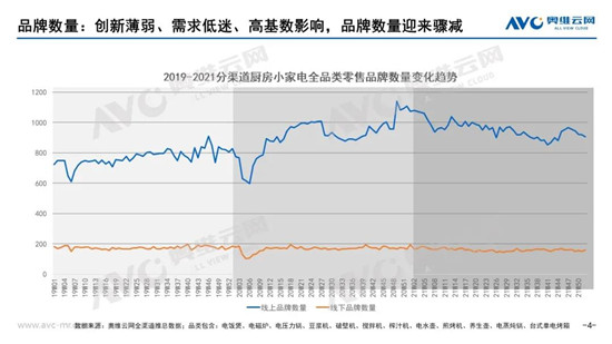 原材料價格上漲,及廚房小家電市場的需求低迷促使長尾品牌壓力持續(xù)增長,2021年以來市場品牌數(shù)量持續(xù)走下坡路。2020年新入場的新興品牌再度遭遇市場洗牌。