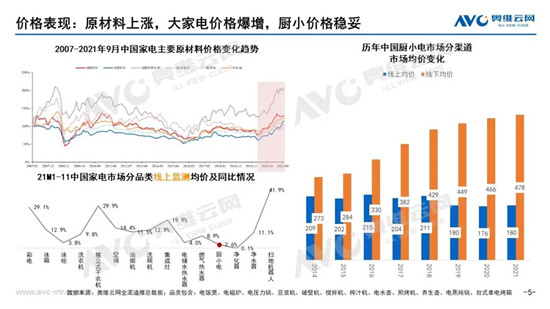 2021年討論熱點之一必然有持續(xù)增長19個月的大宗原材料價格,原材料價格的上漲對各行各業(yè)包括廚房小家電行業(yè)都帶來一定的影響。但是從數(shù)據(jù)層面展現(xiàn)來看,小家電整體均價無論線上還是線下漲幅都不大,相對保守。核心原因來自各品類本身市場需求的疲弱,品牌不敢大幅漲價,其次是頭部品牌之間的“博弈”,都對小家電均價上調(diào)有一定的影響。但是從分月節(jié)奏上來看,后半年以來小家電均價開始增幅有所提升,預(yù)計明年在頭部品牌庫存壓力加劇的情況下迎來均價上調(diào)。