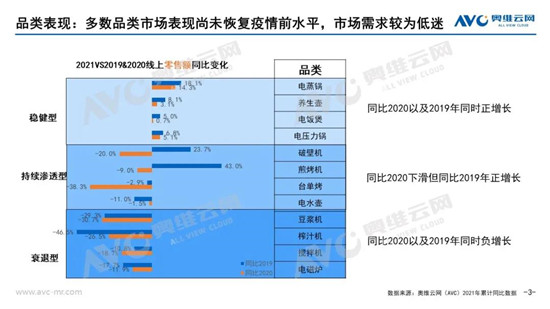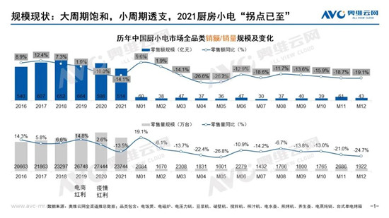 自2021年以來,小家電領(lǐng)域廚房烹飪小家電持續(xù)承壓,源自廚房小家電行業(yè)本身市場周期臨近成熟,加之2020年新冠疫情影響下,宅經(jīng)濟(jì)帶動的火爆銷售促使廚房小家電行業(yè)快速透支,2021年的負(fù)增長成為必然。但是,線下市場恢復(fù)情況過度不近人意,目前來看基本已無翻身之力,企業(yè)亟待探索線上線下融合的更優(yōu)道路。