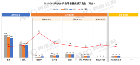 新周期特征二:品類分化達到了拐點。電熱燃熱2021年銷量相比2019年雙雙下滑,據奧維云網(AVC)數據顯示,2019-2021年的這三年間,電熱復合增長率為-6.1%,燃熱復合增長率為-5.9%。雖然,壁掛爐在2021年零售量達到123萬臺,同比增長59.7%。但是,在煤改氣政策收官后進入了行業陣痛期。