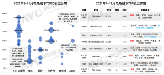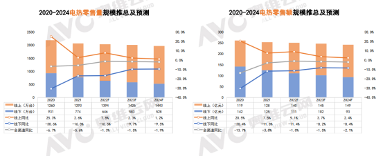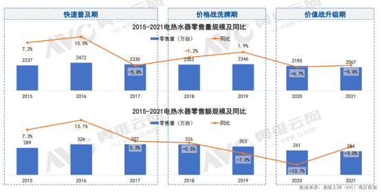 在2015-2017年的快速普及期,電熱飛速增長,零售量從2237萬臺提升至2330萬臺,零售額從289億元提升到327億元,增速超過了10%。在2018-2019年的價格戰洗牌期,零售量維持在2300萬臺左右,零售額在300億元上下浮動,在2020-2021年的價值戰升級期,無論是零售額還是零售額開始下滑,零售量將至2000+萬臺,零售額在254億元。