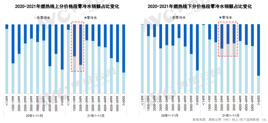 值得注意的是,2021年Q3熱水器精裝配置率達到34.5%,燃熱配置率顯著增長,明顯分流零售市場。銷售端增長率筑底,品類分化和渠道變革均進入了節點期。