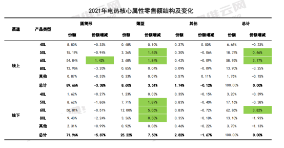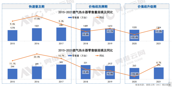 新周期特征一:行業整體規模下降。據奧維云網(AVC)推總數據顯示,2021年全年,電熱水器零售量為2067萬臺,零售額254萬元,同比分別下降5.6%和3.0%,燃氣熱水器零售量為1304萬臺,同比下降1.2%,零售額達到276億元,同比增長4.7%。