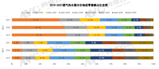 價格方面,據奧維云網(AVC)數據顯示,在2019-2021年三年間,線上市場主要匯集在500-999元價格段,占比約在35%,其次是1000-1499元價格段正在逐漸向1500元以上價格段過度,從占比27.9%的份額縮減至22.7%。線下市場中的各個價格段較為穩定,3500元以上價格段皆有緩慢增長,3500-3999元價格段由6.9%份額提升至10.1%,4000元以上價格段增長至25.4%。