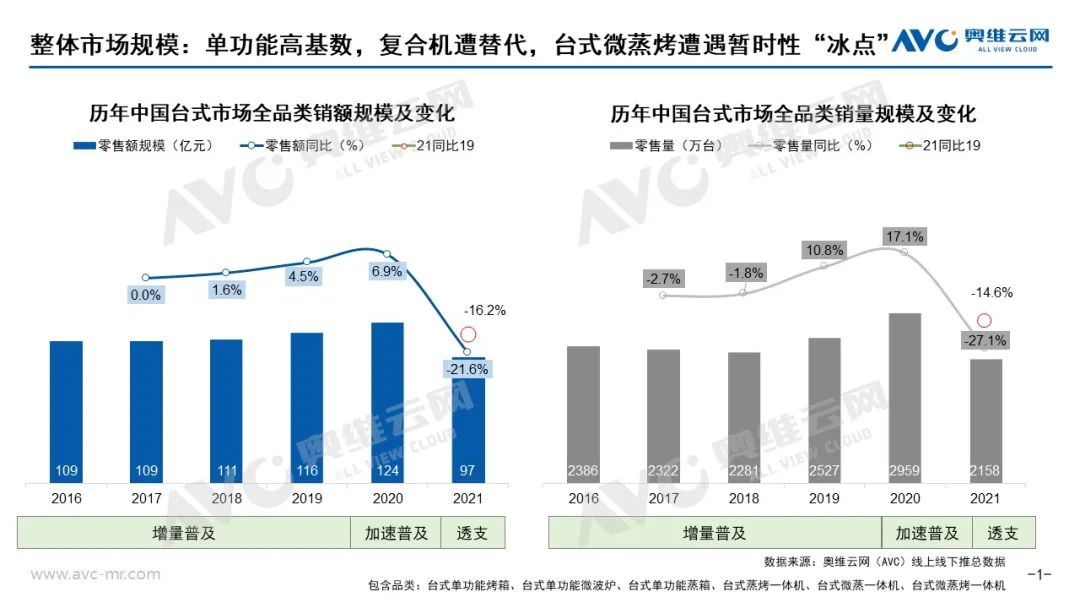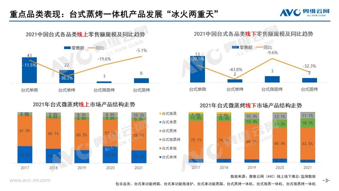 用“大起大落”一詞來(lái)形容偏烘焙類臺(tái)式微蒸烤市場(chǎng)在2020年到2021年的轉(zhuǎn)折再合適不過(guò)了,新冠疫情作為大部分行業(yè)的“殺手”,卻在2020年為烘焙類微蒸烤系列產(chǎn)品送來(lái)東風(fēng),讓與烤相關(guān)的一系列產(chǎn)品滲透率大幅提升,特別是三四線市場(chǎng)得到快速普及,熱度一直持續(xù)到21年開(kāi)年,但是隨著消費(fèi)者復(fù)工復(fù)產(chǎn),“宅經(jīng)濟(jì)”力度的不斷減弱,行業(yè)發(fā)展也逐漸回歸冷靜,高基數(shù)帶來(lái)的負(fù)增長(zhǎng)成為必然。據(jù)奧維云網(wǎng)(AVC)全渠道推總數(shù)據(jù)顯示廚房臺(tái)式微蒸烤系列產(chǎn)品(包含:臺(tái)式單功能電烤箱、臺(tái)式單功能微波爐、臺(tái)式單功能電蒸箱、臺(tái)式蒸烤一體機(jī)、臺(tái)式微蒸一體機(jī)、臺(tái)式微蒸烤一體機(jī))共計(jì)6個(gè)品類全渠道96.8億元,同比下降21.6%,零售量2158萬(wàn)臺(tái),同比下降27.1%;線上零售額76.1億元,同比下降21.0%,零售量1907萬(wàn)臺(tái),同比下降25.1%;線下零售額20.8億元,同比下降23.7%,零售量251萬(wàn)臺(tái),同比下降39.3%。2021年整體概況盤點(diǎn)為以下六點(diǎn):