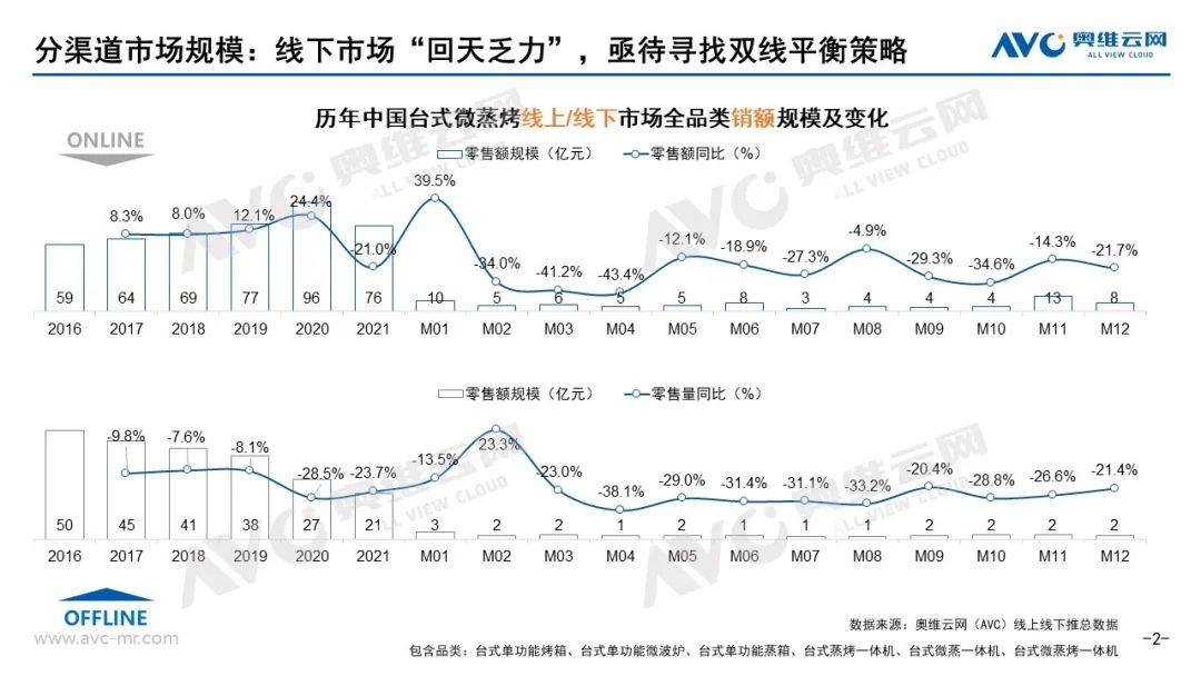 隨著互聯(lián)網(wǎng)快速發(fā)展,以及直播電商的帶動(dòng),就目前來(lái)看均價(jià)較低的小烤箱以及微波爐產(chǎn)品的銷售線上占比連年增長(zhǎng)。線下市場(chǎng),在2020年受疫情影響線下大幅下跌之后,2021年這一走勢(shì)并未有所恢復(fù),同比持續(xù)下降,目前來(lái)看基本已無(wú)回天之力,目前線下主要銷售產(chǎn)品基本為價(jià)格較高的復(fù)合機(jī)產(chǎn)品,面對(duì)的群體也多是銀發(fā)群體,面對(duì)現(xiàn)狀如何做好雙線融合成為各個(gè)企業(yè)的重要課題。從數(shù)據(jù)上來(lái)看今年線上也相對(duì)慘烈,但預(yù)計(jì)2022年透支減弱后會(huì)迎來(lái)回溫,“冰點(diǎn)”也只是短暫的現(xiàn)象。