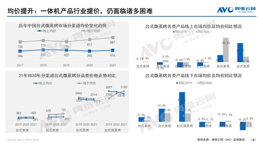 整體來(lái)看臺(tái)式微蒸烤產(chǎn)品均價(jià)有所提升,這與復(fù)合機(jī)產(chǎn)品占比提升有明顯關(guān)系,其次就是原材料價(jià)格的持續(xù)高漲帶動(dòng)烤箱品類以及微波爐品類均價(jià)都有明顯的提升。但是對(duì)于復(fù)合機(jī)品類來(lái)說(shuō)線上價(jià)格不漲反降,分析原因主要有1、產(chǎn)品均價(jià)本身較高。2、頭部結(jié)構(gòu)不穩(wěn)定競(jìng)爭(zhēng)激烈犧牲價(jià)格。但是同比19年降幅逐漸收窄,各企業(yè)競(jìng)爭(zhēng)價(jià)格戰(zhàn)有所放緩。