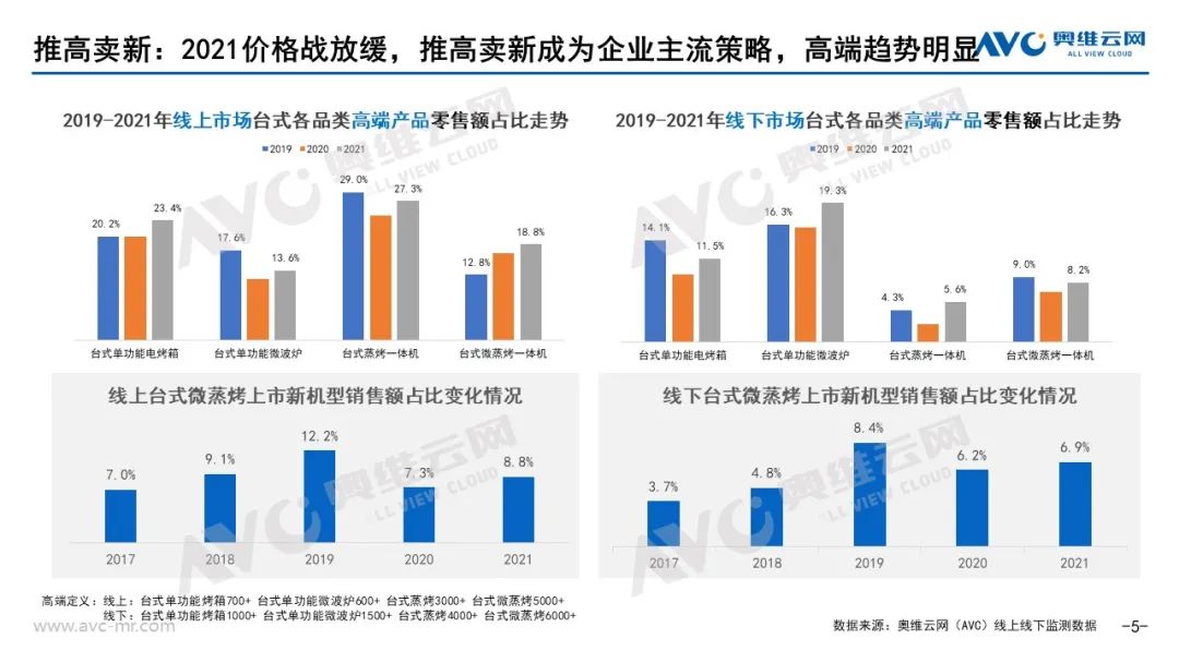 原材料價(jià)格上漲,整體市場(chǎng)面臨高基數(shù)背景下的需求低迷,企業(yè)亟需調(diào)整發(fā)展策略來(lái)面對(duì)市場(chǎng)的不利因素,推高賣新則是重中之重,從奧維云網(wǎng)(AVC)監(jiān)測(cè)數(shù)據(jù)顯示無(wú)論是線上還是線下,各個(gè)品類都呈現(xiàn)明顯的高端化且新品市場(chǎng)份額相比2021年有明顯的提升。希望這種良性發(fā)展可以持續(xù)。