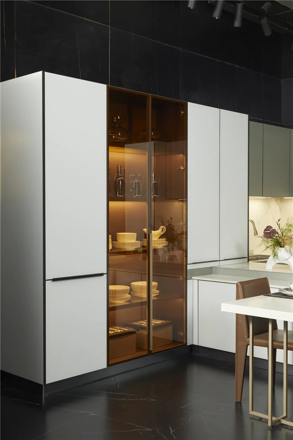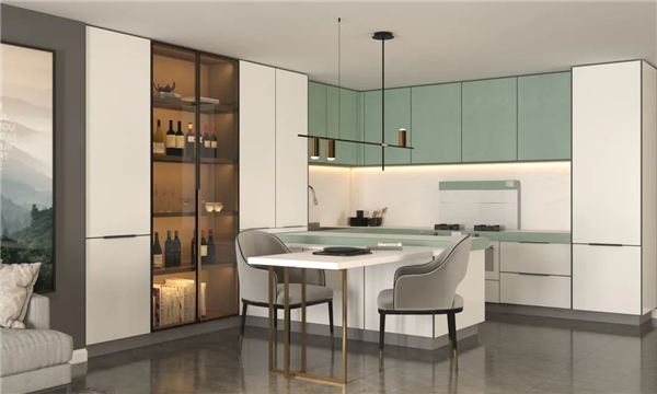 廚電與廚柜在顏色、布局上完美結合,和諧統一,宛若天成。雅致的巖意抹茶綠,純凈的油砂白,營造出清新自然的畫面。U型的布局,流暢的動線,操作得心應手,烹飪無所束縛,廚房享受應如是。