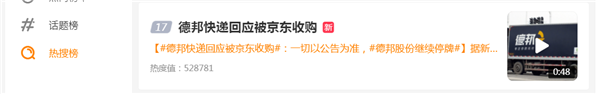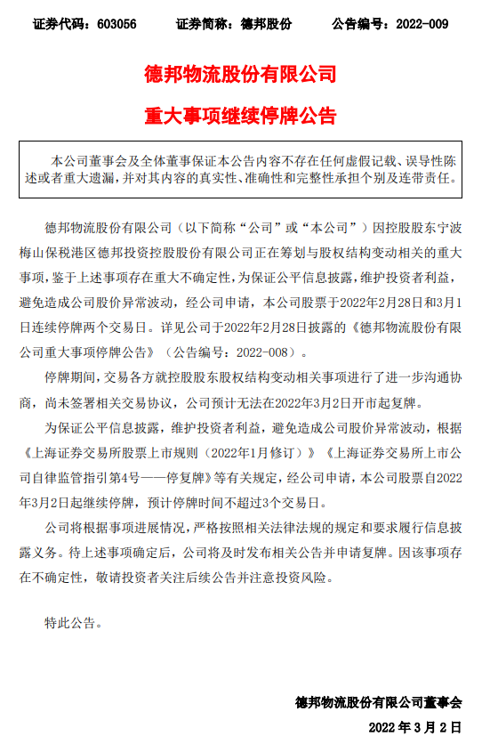 對(duì)此京東方面暫未回應(yīng),德邦則回應(yīng)稱一切以公告為準(zhǔn)。德邦最新的公告顯示,其控股股東正在籌劃與股權(quán)結(jié)構(gòu)變動(dòng)相關(guān)的重大事項(xiàng),公司股票自2022年3月2日起繼續(xù)停牌。