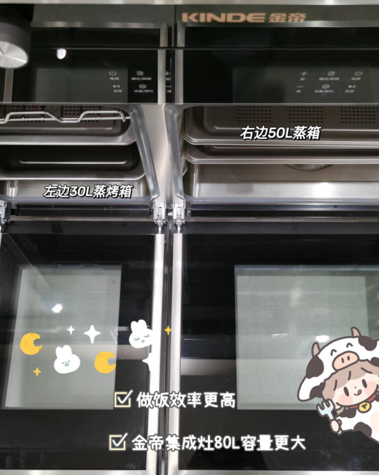 金帝雙蒸一烤集成灶擁有兩個(gè)單獨(dú)的箱體左邊30L蒸烤箱,右邊50L蒸箱,加起來(lái)足足有80L,比其他區(qū)區(qū)只有50L的蒸烤集成灶來(lái)說(shuō),容量不止大了一點(diǎn)點(diǎn)呢~