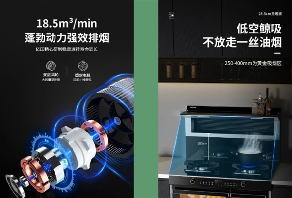 億田S8A蒸烤獨(dú)立集成灶,升級擋煙板高度至28.5cm,配上18.5 m3/min的大風(fēng)力,油煙一升騰便消于無形,油煙吸凈率高達(dá)99.95%,從此無懼油煙,呼吸無憂,還廚房一片潔凈。
