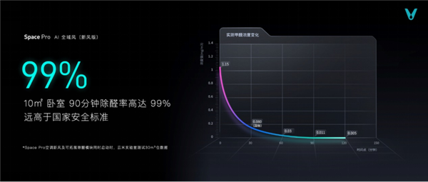 而Space Pro云米AI全域風空調(新風版)則是使用國家863計劃科研成果的活性錳催化除甲醛,解決了過去的除甲醛技術存在的諸多問題,將甲醛徹底分解成無害的水、二氧化碳,無二次污染,且效果永久不衰減。10m2臥室90分鐘除醛率高達99%,遠高于國家安全標準,給用戶帶來最優質的健康呵護。