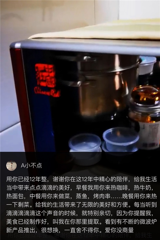 “已經12年整,謝謝你在這12年的精心陪伴,給我生活帶來點點滴滴的美好,早餐我用你來熱咖啡、熱牛奶,午餐用你來做菜、蒸魚,給我的生活帶來了無限的美好和方便。”一名叫AI小不點的網友在曬出在家中國紅微波爐時感慨道。(需截圖截到China Red)