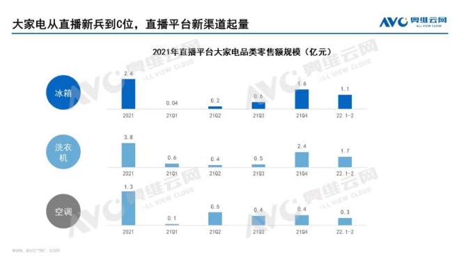 據(jù)奧維云網(wǎng)(AVC)《大家電直播電商平臺分析報告》,2021年直播平臺大家電冰箱、洗衣機、空調(diào)三大品類零售額分別為2.4億元、3.8億元、1.3億元,均已達到較為可觀的體量。分季度來看,大家電從Q1開始逐步起量,冰箱從21年Q1的0.04億元增長到Q4的1.6億元。洗衣機從0.6億元逐漸增長到2.4億元。空調(diào)也從0.1億元發(fā)展到0.4億元的規(guī)模,發(fā)展勢頭強勁。奧維云網(wǎng)大家電研究員王蕾認為,由于抖音快手等直播、短視頻平臺加速商業(yè)化變現(xiàn),直播平臺和企業(yè)互動加強,品牌企業(yè)開始重視直播平臺的業(yè)務(wù)增量以及內(nèi)容運營對私域流量的導流作用,在業(yè)務(wù)模式和大家電產(chǎn)品的物流配送安裝以及售后服務(wù)等商業(yè)流程的跑通和逐步完善后,2022年極有可能迎來大家電直播電商發(fā)展的元年,品牌企業(yè)快速布局正當其時。