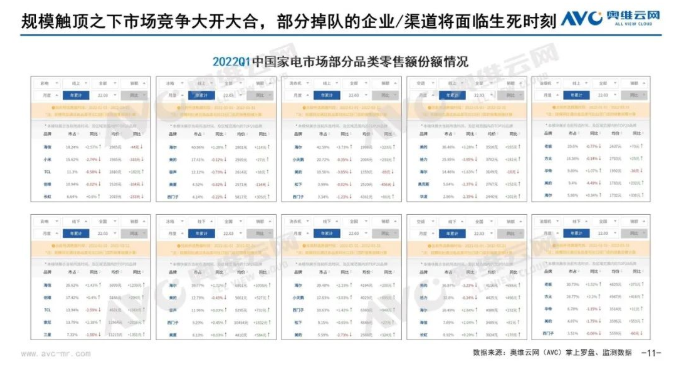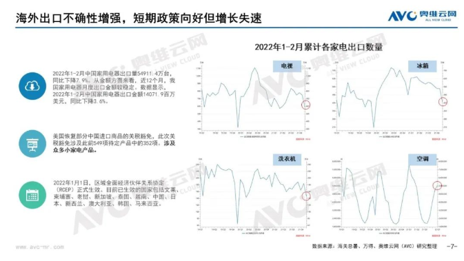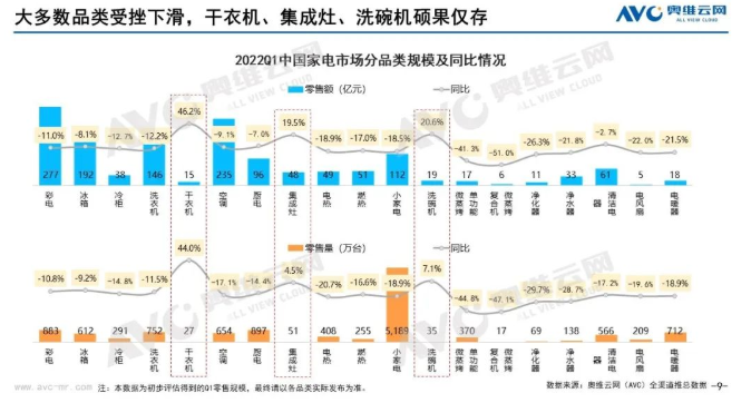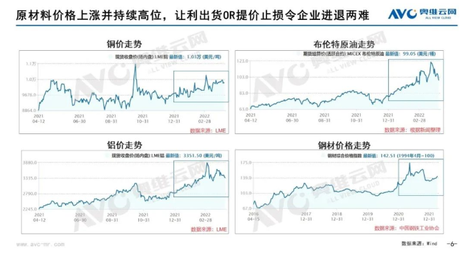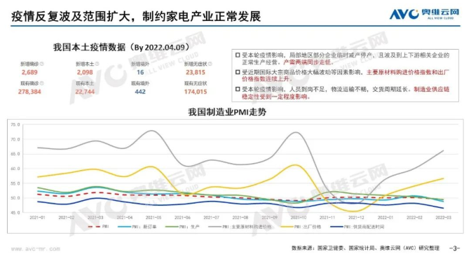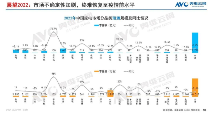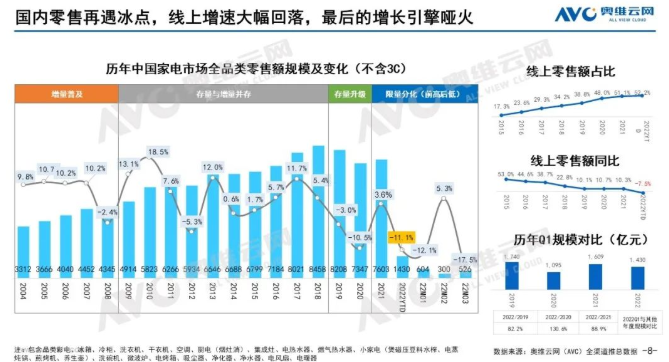 奧維云網(AVC)推總數據顯示,2022年一季度中國家電零售額1430億元,同比下降11.1%,疫情嚴重抑制需求釋放。整體來看,國內消費及投資意愿疲軟,市場需求釋放嚴重不足。此外,原材料價格持續上漲并保持高位,雖然令產業鏈上游的供應商利潤情況有所好轉,但卻令處于末端的家電整機企業負重前行。疫情帶來的局部區域賣場停擺和物流阻塞問題不僅影響線下市場,線上市場也受到波及,由疫情引致的物流停發、交付延遲、退貨提升、客訴提高等問題屢見不鮮,一季度線上市場規模下滑。同時,海外出口的不確性也在增強,雖短期政策向好但規模增長失速。