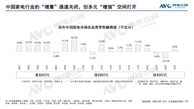 在行業最初發展的幾十年,中國家電市場產品不足、信息不對稱、需求粗放,中國家電市場處于渠道為王的“暴利時代”。而經歷了改革開放發展至今,家電供給從過去的產能不足到產能過剩,互聯網和電商高度發展,交通基建四通八達,家電市場的“暴利時代”徹底終結,繼而進入“薄利時代”。然而,市場的車輪從未停滯不前,隨著中國經濟步入新常態,以及緊隨其后的疫情沖擊,市場的增長驅動因素再一次被重調。在需求釋放不足、消費持續升級、用戶年輕化細分化、需求前置分流等等因素疊加作用下,我們再一次看到只有深度經營用戶、切實提升產品、服務、體驗,認真經營碎片化渠道才能有機會觸碰新一輪的增長。家電市場進入“厚利時代”,產品、服務、品牌、體驗、多元經營的增值空間都已打開!