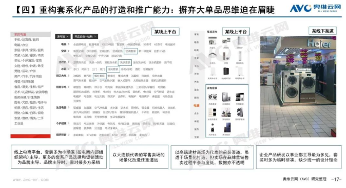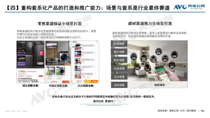 如今的家電業大多的情況是,“莫問出處,賽道歸一”。家電企業從過去的分子行業的不同賽道競爭逐漸轉變為分場景、分套系的同一賽道競爭,然而現實情況更多是市場上傳統的大單品思維推廣模式并未完全切換到場景化、套系化的運營模式。以線上電商平臺為例,套裝多為小場景主導(和電商內部組織架構以單品劃分有很大關系),而更多的套系產品選擇和促銷活動為品牌主導。此外,以家電連鎖代表的零售賣場仍多以單品陳列為主,場景化改造任重道遠。以高端建材商場為代表的前裝渠道,雖適于場景化打造,但目前數據不夠透明,應驗經營大于科學經營。此外大多企業產品研發仍以事業部主導最為多見,套裝時多為臨時拼湊,難以做到設計理念的完整統一。