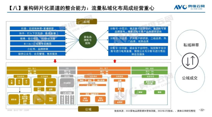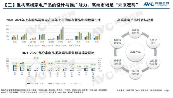 整個行業的目光從“規模導向”轉為聚焦“利潤導向”,“推新賣貴”。高端化,既是經濟發展到一定階段,消費升級的必然產品,也是中國家電市場多重維度的深化裂變之后體現出來的必然之路。此外,企業端的不斷推動也起到了至關重要的作用。在需求釋放不足,規模增速回落甚至轉負的背景下,高端化成為企業在“至暗時刻”持續落地規模增長、利潤增長戰略的必經之路,行業的聚焦點也“量”向“質”轉型。奧維云網(AVC)監測數據顯示,無論是在線上市場,還是線下市場,企業在布局新品時都向高端產品布局有所傾斜。高端家電也將在“厚利時代”大放異彩,奧維云網(AVC)預測,2022年中國高端家電市場將持續增長。預計2022年15,000元以上的高端電視產品的零售額將達到150億元,同比增長31.7%。高端白電的零售額規模將達到461億元,同比增長18.5%。其他家電高端家電產品預計也將各有提升。