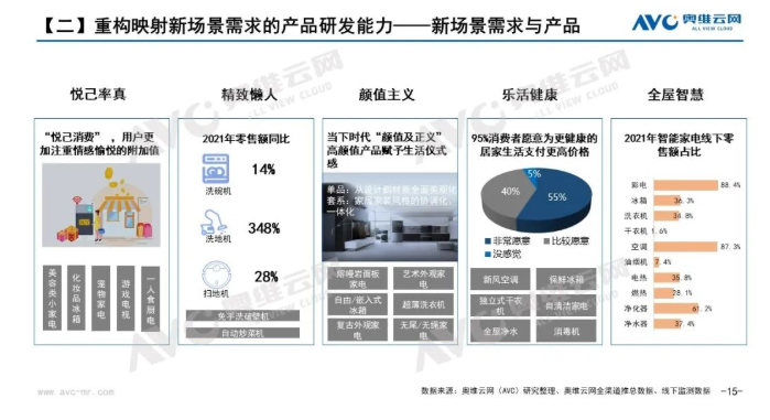 新需求和新場景的消費趨勢逐漸完善和形成,以美容類小家電、寵物家電、游戲電視等產品為代表的“悅己”場景、以洗碗機、洗地機、掃地機器人等為代表的“懶人”場景、以藝術化外觀家電、自由嵌冰箱、超薄洗衣機等為代表的“顏值消費”場景、以新風空調、保鮮冰箱等為代表的“健康場景”,以及智能家居場景等等正在逐漸形成。