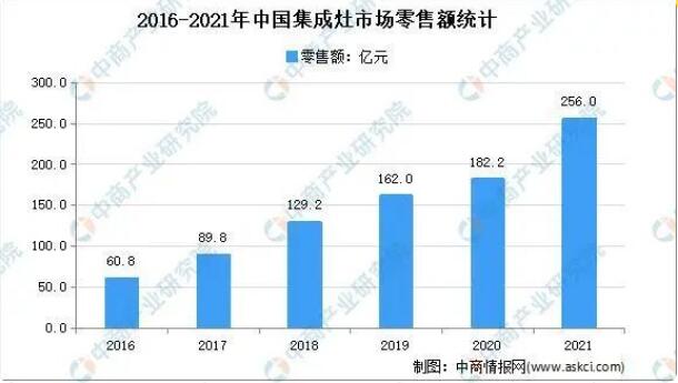 據(jù)奧維云網(wǎng)(AVC)數(shù)據(jù)顯示,我國集成灶市場零售額由2016年的60.8億元增至2020年的182.2億元,年均復合增長率達31.6%。截至2021年12月底,我國集成灶市場零售額達256.0億元,同比增長41%,龐大的數(shù)字和增長率,印證著集成灶已經(jīng)逐漸被越來越多人認可,已經(jīng)成為現(xiàn)代廚房的優(yōu)先選擇。