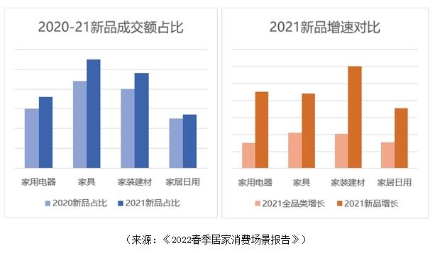 近日,京東消費及產業發展研究院聯合新浪家居發布的《2022春季居家消費場景報告》指出,居家場景已經成為消費的重要增長極,其中智能化正在整合居家與家電等相關行業;基于京東消費情況,新一代消費者對自身需求更為明確,在近一年中,京東商品上新數量超千萬,新品年度銷售額貢獻已超六成。同時,新品消費用戶整體銷量貢獻占比達34%,平均消費單價是整體平均的1.4倍。因此,年輕消費者的新品消費偏好給眾多細分品類帶來了彎道超車空間。