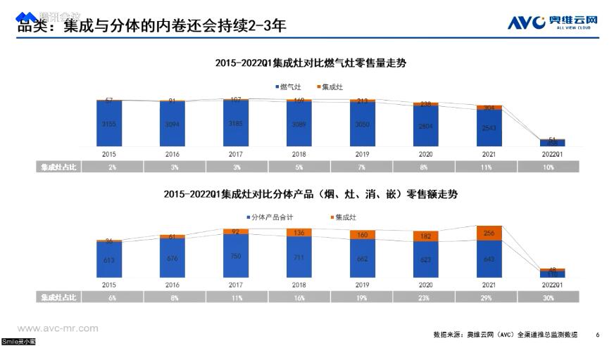 同時。奧維云網(AVC)在一份研報中分析認為,目前集成灶的需求占比,即集成灶零售量/(集成灶零售量+燃氣灶零售量),從2015年的2%增長至了2021年的11%,2022年一季度為10%。集成灶的規模占比,即集成灶零售額/(集成灶零售額+油煙機零售額+燃氣灶零售額+消毒柜零售額+嵌入式零售額),從2015年的6%增長至了2021年的29%,2022年一季度為30%。按照目前趨勢判斷,集成灶未來仍有2-3年的穩定成長期。