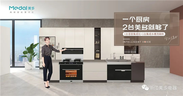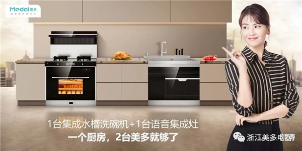 一臺美多語音蒸烤類的集成灶1臺=16臺,集合油煙機、燃氣灶、消毒柜、置物臺、蒸箱、烤箱、保溫箱、電飯煲、0.9米櫥柜、面包機、烘干機、發酵機、炸鍋、蒸蛋器、電燉鍋、電烤架,方寸間凝聚美食創想。一臺美多集成水槽洗碗機搭載洗滌、切配、洗碗、除菌、消毒、烘干,一機多用!兩者更好搭配櫥柜風格,更顯品位和優雅,集成廚電占地面積小,省下空間可隨心利用,吊柜還能增加儲物,非常實用。