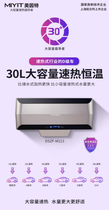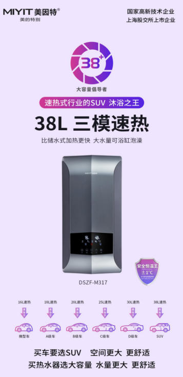 在美因特看來,速熱式行業未來的發展方向一定是大容量速熱,速熱式電熱水器的發展,將會與汽車產品的發展一樣,16L類似于微型車,18L類似于A級車,20L類似于B級車,25L類似于C級車,30L類似于D級車,38L類似于SUV。買車要選SUV,空間更大更舒適,買速熱式熱水器要選大容量,水量更大更舒適。