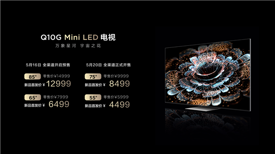 TCL萬象星河Q10G Mini LED共有4款新品,5月16日開啟全網預售,5月20日正式開售!85吋新品首發價12999元,75吋新品首發價8499元,65吋新品首發價6499元,55吋新品首發價4499元。