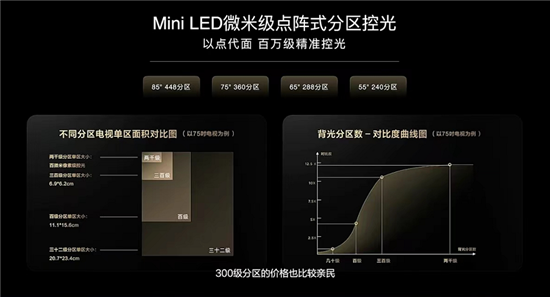 比起傳統LED,Mini LED的最大優勢就是在于“Mini”——即比LED采用更小的燈珠,在相同大小的熒幕中承載更多的燈珠,色彩的單位更小,可以更準確地表現每一個畫面中色彩的差異和變化,顯示畫面也會更加細膩,亮度會更高;實現更多背光分區,即意味著較高的對比度和更多明暗細節,減少漏光問題。在畫質提升的同時,體積也更加纖薄。