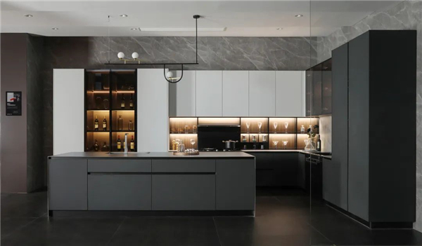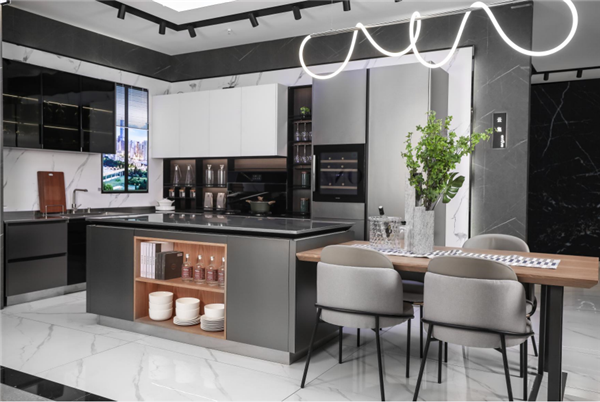 億田不銹鋼臺面,高級感十足,配合整體輕奢質感,又防指紋、耐刮花、易清潔。柜體+背墻系統,強大的收納能力與視覺調性相平衡,空間通透明亮,享受愜意生活。