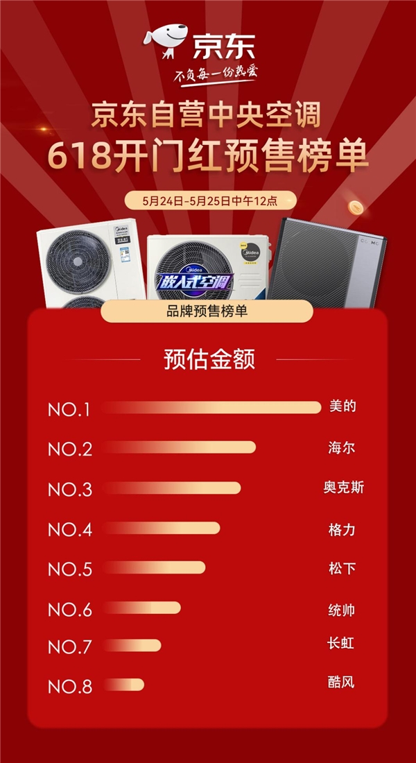 適逢618大促即將到來,從近日京東自營中央空調(diào)銷售榜單(品牌預(yù)售榜單)中可以看到,美的中央空調(diào)以明顯的優(yōu)勢(shì)排在榜單榜首,預(yù)售金額排名第一遙遙領(lǐng)先,通過預(yù)售排名不難看出一個(gè)品牌蓄水的能力及市場(chǎng)認(rèn)可程度,可見美的中央空調(diào)已成為眾多消費(fèi)者的購買首選。