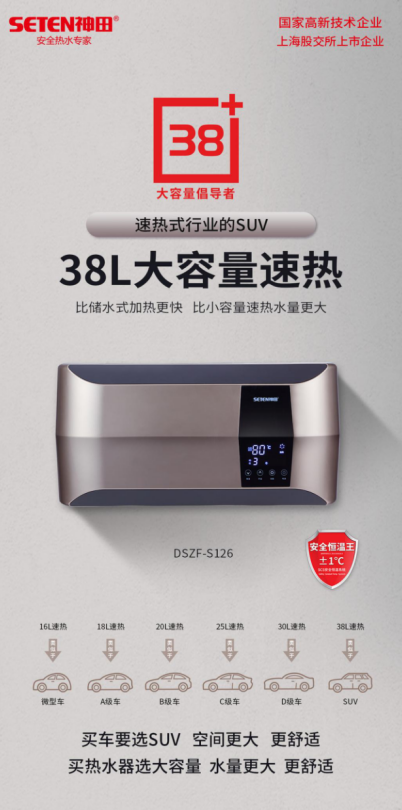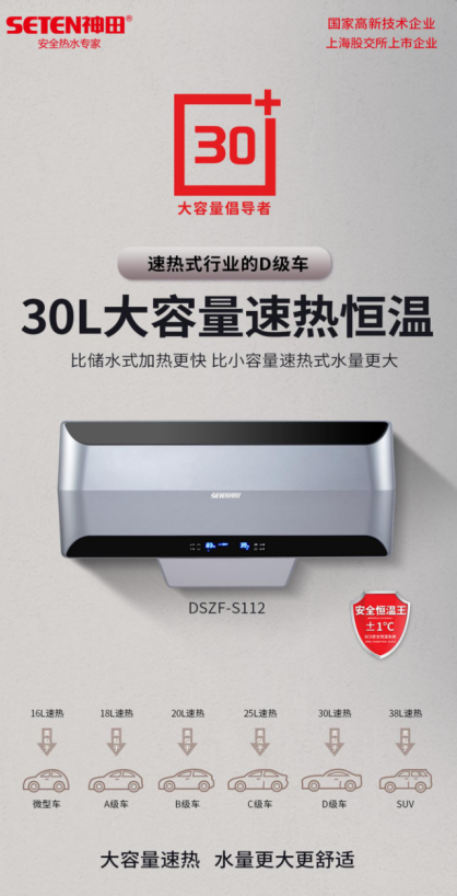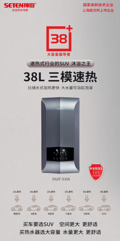 2020年神田開發出30升大容量速熱S112,體積比儲水式電熱水器更小,加熱更快,水量比小容量速熱充沛。2021年,神田又推出38升大容量速熱,38升大容量三模速熱水量足夠充沛,可以洗浴缸,是行業內真正的沐浴之王。