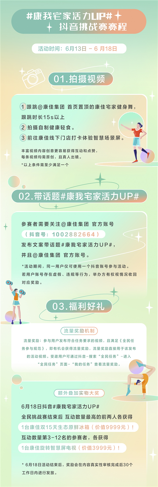此次康佳“康我宅家活力UP”全民挑戰(zhàn)賽分為線上線下兩個部分,線上抖音挑戰(zhàn)賽活動時間為6月13日-18日,共6天。活動期間,參賽者可登錄抖音短視頻平臺客戶端,拍攝康佳健身操、制作健康輕食視頻,或者前往康佳線下門店體驗產(chǎn)品即有機(jī)會獲得價值9999元的康佳生態(tài)原鮮冰箱和價值3999元的康佳旋轉(zhuǎn)屏智慧屏電視等超值大禮!