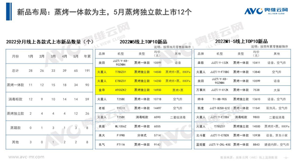 據奧維云網(AVC)線上監測數據顯示,2022年1-5月集成灶上市新品共191個,蒸烤一體款90個、消毒柜款59個、蒸烤獨立款26個。新品TOP10機型中,4款帶有語音功能,森歌1款、奧田1款、帥豐1款、北斗星1款。