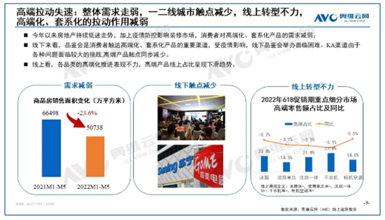 高端拉動(dòng)失速:以往來(lái)看,高端化、套系化產(chǎn)品對(duì)整體銷額表現(xiàn)起到重要的拉動(dòng)作用。然而,今年以來(lái)房地產(chǎn)持續(xù)低迷走勢(shì),加上疫情防控影響裝修市場(chǎng),消費(fèi)者對(duì)高端化、套系化產(chǎn)品的需求減弱。線下來(lái)看,高端產(chǎn)品的觸點(diǎn)逐步減少。品鑒會(huì)是消費(fèi)者觸達(dá)高端化、套系化產(chǎn)品的重要渠道,受疫情影響,線下品鑒會(huì)舉辦面臨困難。此外,KA渠道由于各種問(wèn)題面臨較大的挑戰(zhàn),高端產(chǎn)品觸點(diǎn)同步減少。線上看,各品類的高端化推進(jìn)表現(xiàn)不力,高端產(chǎn)品線上占比呈現(xiàn)下滑趨勢(shì)。