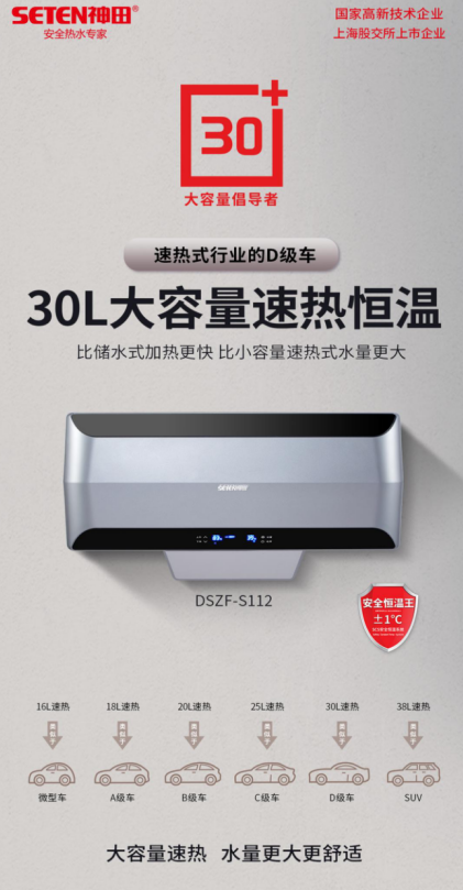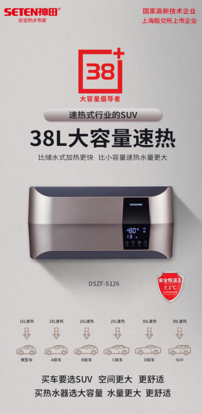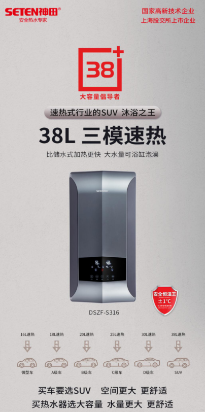 因為S112的銷售火爆,使得神田集團堅定了開發大容量速熱的信心。2021年,神田又推出38升大容量速熱S126/S316。