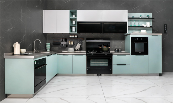 億田集成廚房,采用巖意抹茶、冰激凌白、奶昔莓紅等高端專屬格調配色.不銹鋼覆膜石紋門板,還原自然肌理,沉穩大氣,極具魅力,更在素雅中深藏清涼感覺,為您抵消廚房撲面而來的極致悶熱感。
