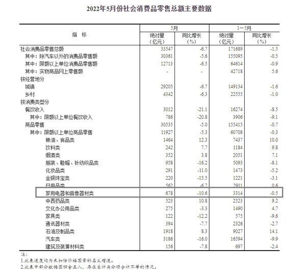數據顯示,5月份家用電器和音像器材類商品銷售額為678億元,同比下降10.6%。