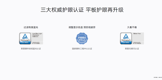 榮耀平板8通過了三重權(quán)威護(hù)眼認(rèn)證,支持萊茵硬件級(jí)低藍(lán)光,獲得了萊茵無頻閃認(rèn)證以及國家眼科工程中心護(hù)眼認(rèn)證。同時(shí),榮耀平板8還適配了一系列軟件護(hù)眼方案,并針對(duì)K12青少年人群推出“健康使用平板”功能,可對(duì)距離過近、躺姿觀看、暗光環(huán)境及手持抖動(dòng)等對(duì)視力有影響的不良使用姿態(tài)進(jìn)行提醒,軟硬兼?zhèn)淙嫣嵘o(hù)眼能力,致力引領(lǐng)平板護(hù)眼標(biāo)準(zhǔn)再升級(jí)。