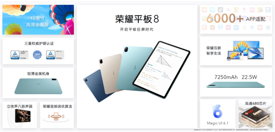 作為榮耀智慧生活產(chǎn)品的中重要一員,榮耀平板一直堅(jiān)持以協(xié)同能力與特色功能而被用戶所青睞。此次榮耀平板8不僅在價(jià)位上進(jìn)一步降低消費(fèi)者的入手門檻,更帶來金屬機(jī)身、業(yè)界首款12英寸護(hù)眼大屏、8揚(yáng)聲器音頻系統(tǒng)等頂級(jí)配置。圍繞家庭用戶的移動(dòng)影音場景與家庭學(xué)習(xí)場景,聚焦孩子護(hù)眼、學(xué)習(xí)效率等痛點(diǎn),榮耀平板8通過全面的科技加持與用戶體驗(yàn)打造,堪稱影音、學(xué)習(xí)全面進(jìn)階的誠意之作,也是繼百萬銷量的榮耀平板7之后的又一款榮耀標(biāo)桿新品。