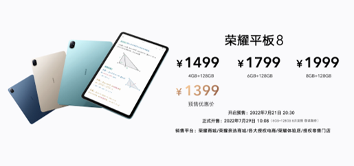 7月21日20:30,榮耀平板8在榮耀商城、榮耀親選商城、各大授權(quán)電商,榮耀體驗(yàn)店和榮耀授權(quán)店同步開啟預(yù)售,4GB+128GB版本官方售價(jià)1499元(預(yù)售優(yōu)惠價(jià)1399元),6GB+128GB版本官方售價(jià)1799元,7月29日10:08正式開售,8GB+128GB版本官方售價(jià)1999元,將于8月開售。此次還發(fā)布了榮耀親選推出的榮耀平板8智能鍵盤,這款鍵盤可還原筆記本的1.6mm高鍵程和18.8mm寬鍵距,打字回彈清晰不生硬,鍵盤尺寸舒適不局促,雙手放上鍵盤無需適應(yīng),文字從指尖暢快輸出,與榮耀平板8搭配,助力學(xué)習(xí)辦公效率全面升級(jí)。榮耀平板8智能鍵盤官方售價(jià)279元。