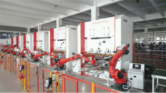 在金帝智能廚電產業園,工業機器人代替了傳統人工高質量完成各項生產程序。過去,生產的零部件要靠人工取出,耗時耗力,還有很大安全風險。如今,金帝六軸機器人包攬了這個工作,更省時、更準確、更安全。