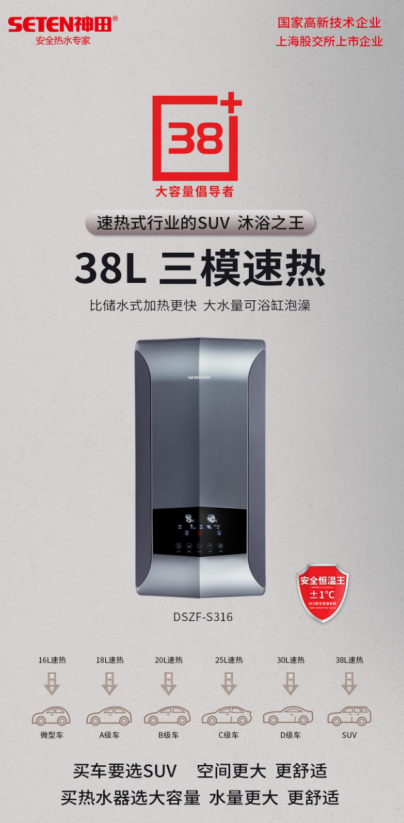 正是因?yàn)椋樱保保驳某晒Γ沟蒙裉锖笃谙嗷ラ_發(fā)出38升的大容量速熱。目前神田30升以上的大容量速熱產(chǎn)品多達(dá)七款。38升大容速熱可以真正的滿足浴缸沐浴的要求,是速熱行業(yè)的沐浴之王。