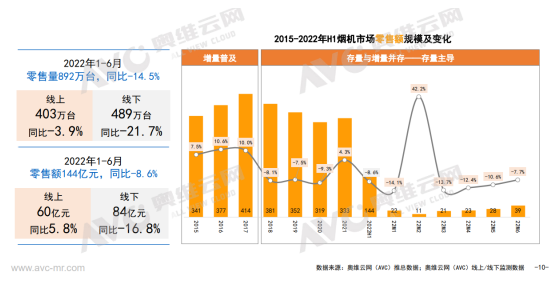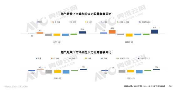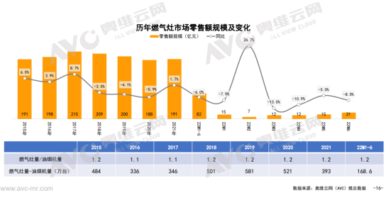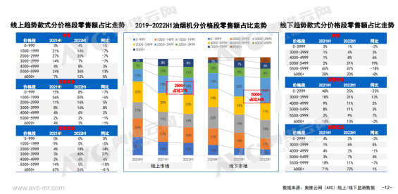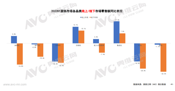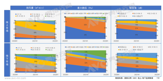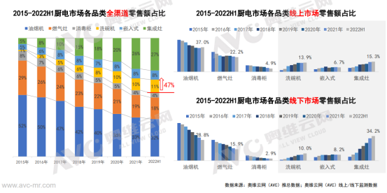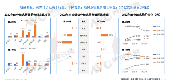 正是如此,我們看到了近幾年油煙機行業的升維之路。來自奧維運網(AVC)推總數據顯示,盡管2022年1-6月份油煙機零售量892萬臺,同比-14.5%,零售額144億元,同比-8.6%,但是超薄低吸煙機、跨界煙機、頂側雙吸煙機表現不錯,其中超薄低吸煙機1-6月在線上市場零售額同比增長了143%,線下市場同比增長了339%;跨界煙機線上線下同比分別增長了19%和31%;頂側雙吸煙機則在線上市場同比爆增310%,線下市場則同比下滑了16個百分點。