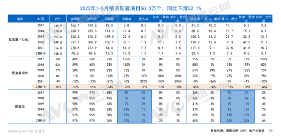 根據奧維云網(AVC)地產大數據顯示,2022年1-5月,商品住宅精裝開盤項目總計676個,同比-45.4%,精裝規模50.3萬套,同比-52.1%。