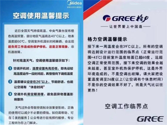 同時,互聯網上傳出了兩為空調巨頭——格力和美的的溫馨提示單頁,單頁顯示40℃以上的高溫環境會對空調的制冷功能產生影響,建議用戶將空調溫度設定在26℃以上,以免空調過載保護造成停機。 目前,沒有證據證明通知的真偽。但是提示單頁上的說明和操作建議,得到了互聯網上一些專業人士的認可,具有一定的可信度。