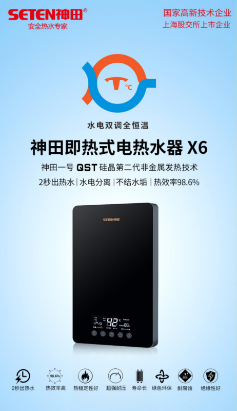 2021年12月,神田推出新品X6,這款高端產品最引人關注的就是采用了水電雙調全恒溫技術與神田一號QST硅晶第二代非金屬發熱技術。
